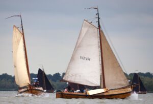 We hadden dit keer een jonge groep mee en die hadden voor twee schepen ravitaillering mee genomen. De aak lag er diep van. Voor ons oudere jongeren toch even fronzen, helemaal toen er ook twee beatboxen met twee microfoons aan boord kwam… De vlag van het bedrijf Van den Brink koeltechniek 2 moest ook op worden gehangen. Het bleek geen normale vlag, maar meer van spinakerformaat. Voor de vorm hebben we geprobeerd het omhoog te hijsen, maar om door het enorme extra zeiloppervlak, er weer afgehaald. De organisatie had al gezegd dat alleen de kluiver eerbij mocht en dat een spinaker direct tot diskwalificatie zou leiden.